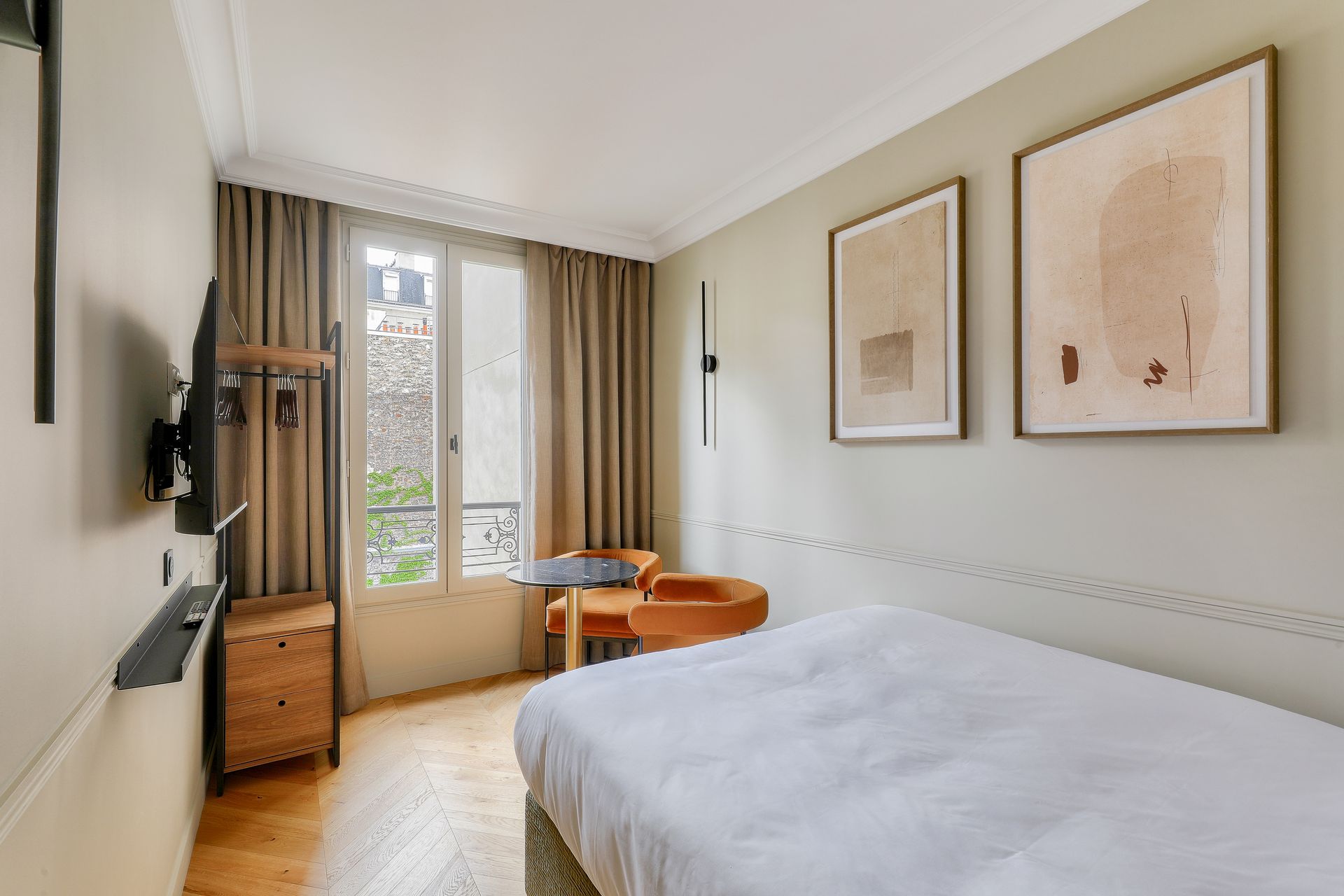 Ce qui distingue véritablement cette chambre, c'est la vue imprenable sur le jardin intérieur de la Maison du Moulin Vert. Cette perspective offre un havre de paix visuel, invitant à la contemplation et à l'évasion, loin de l'agitation du quotidien.