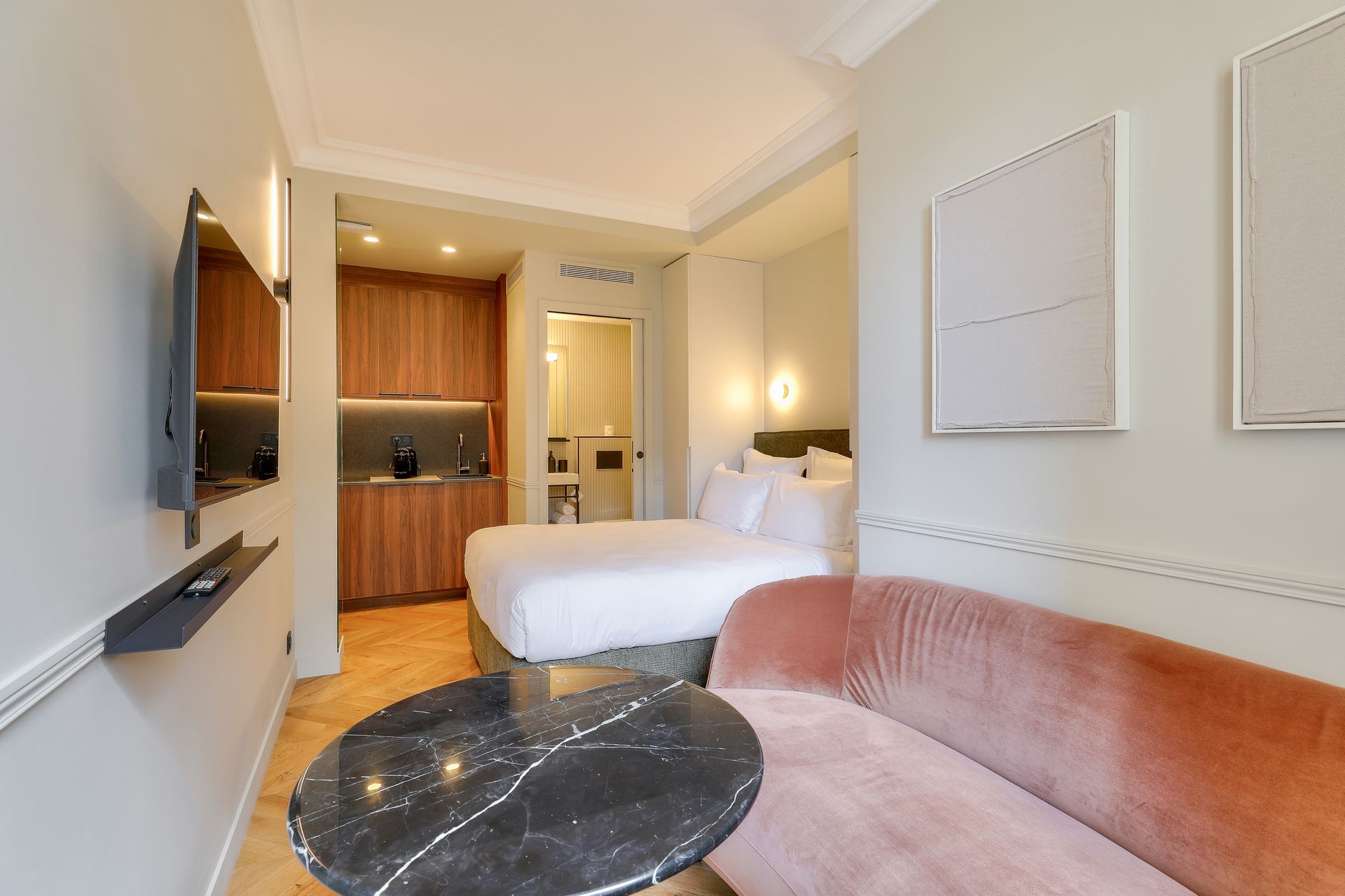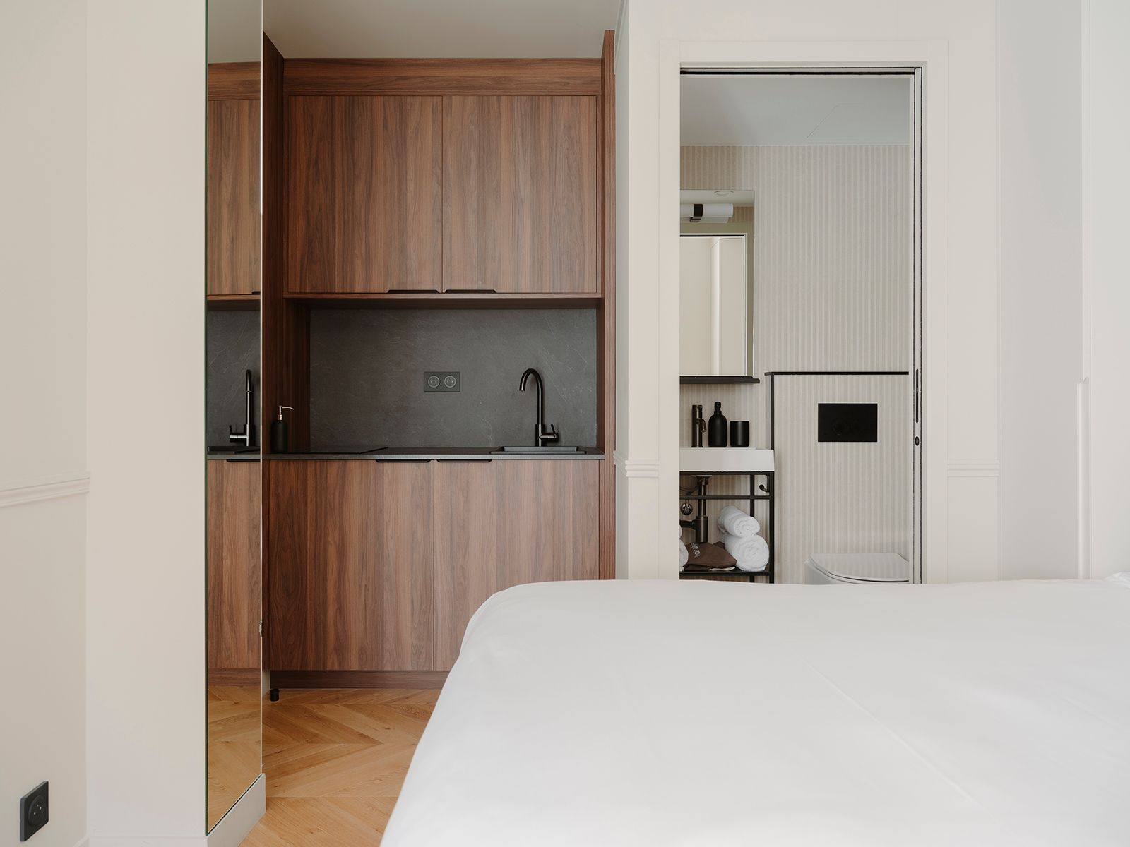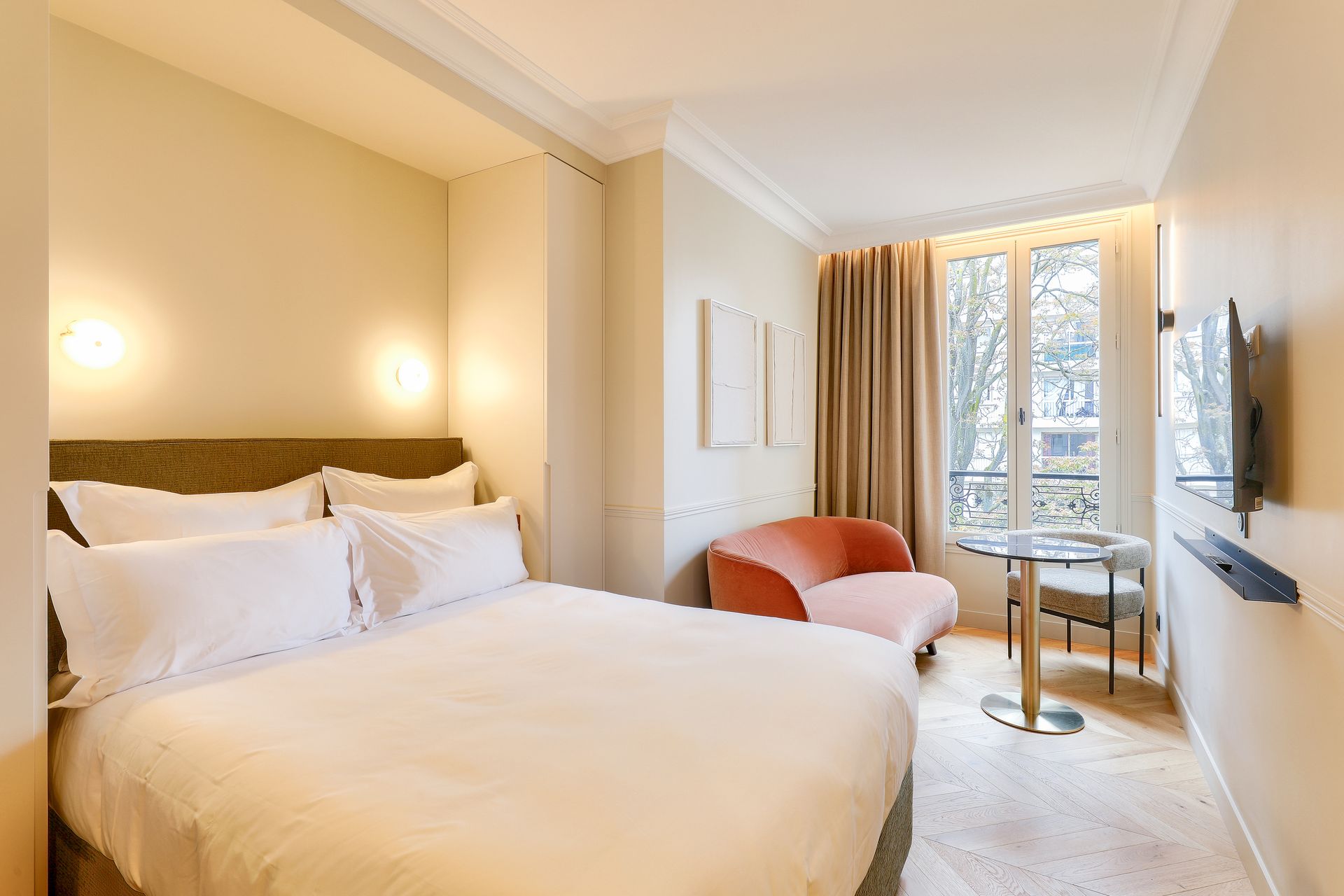 Cette chambre mise sur l'essentiel, offrant un espace de travail dédié, pensé pour les moments de réflexion ou de créativité. Ici, le calme et la tranquillité vous enveloppent, permettant de vous concentrer ou simplement de vous évader dans vos pensées, entouré d'un décor chic et d'une vue sur le jardin intérieure de la Maison du Moulin Vert.